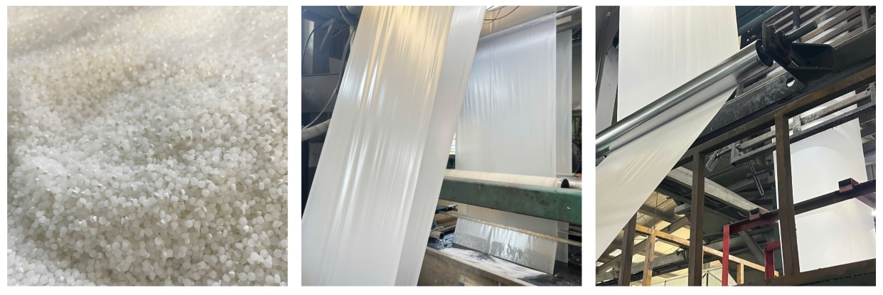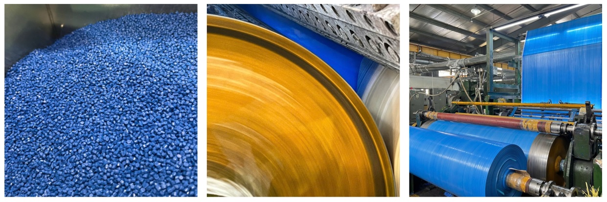 The raw material comprises polyethylene resin pellets, which act as the foundation for producing blue tarpaulins. These pellets are melted down and shaped into a thin film, forming the initial stage of the production process.