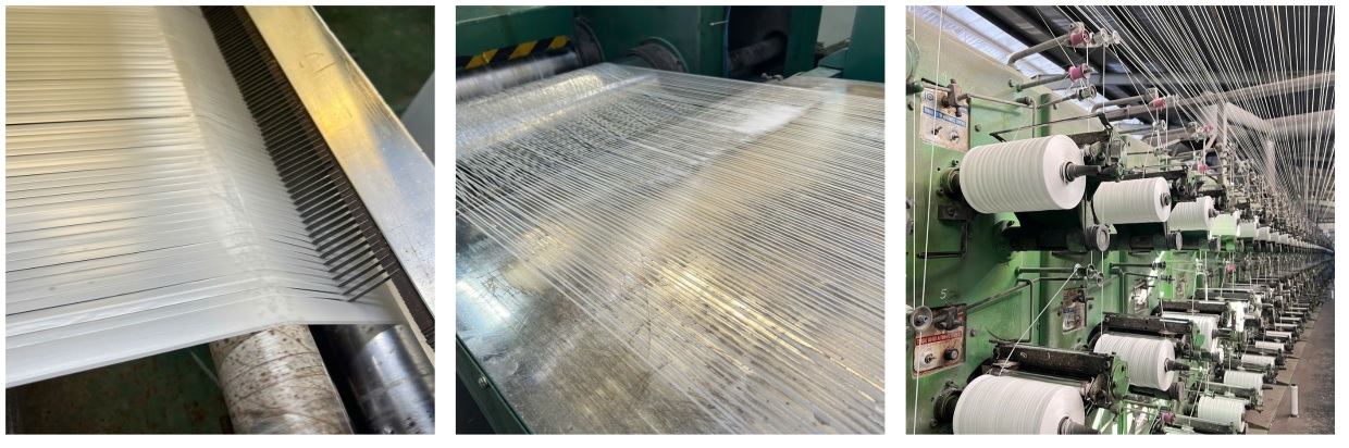 The film is slit into smaller sections and stretched using heat plates and rollers. This stretching process produces thin, strong fibers. The finished fibers are then rolled up individually by a machine.